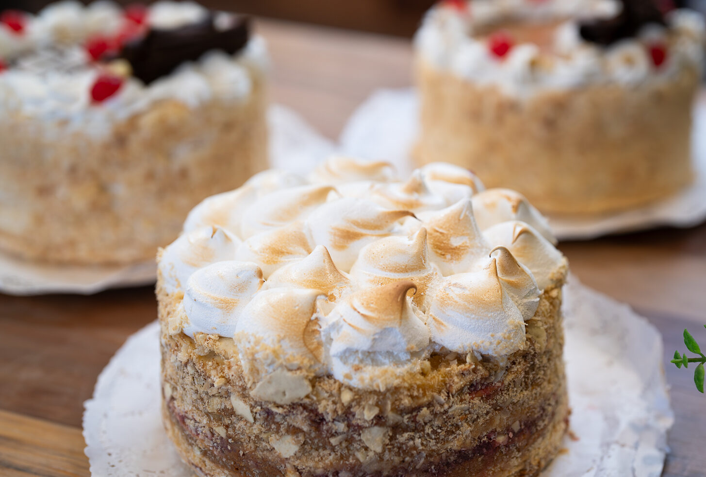 Suaves discos de pasta Choux con relleno de crema pastelera, manjar y mermelada de frambuesas, cubierta con crema chantilly.